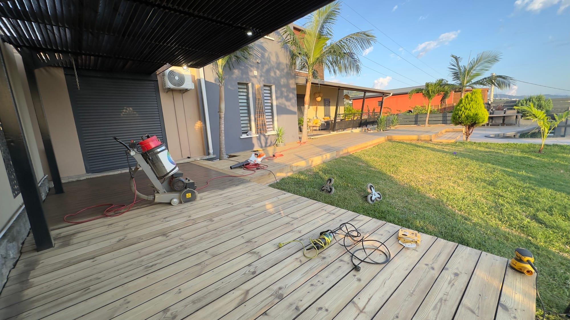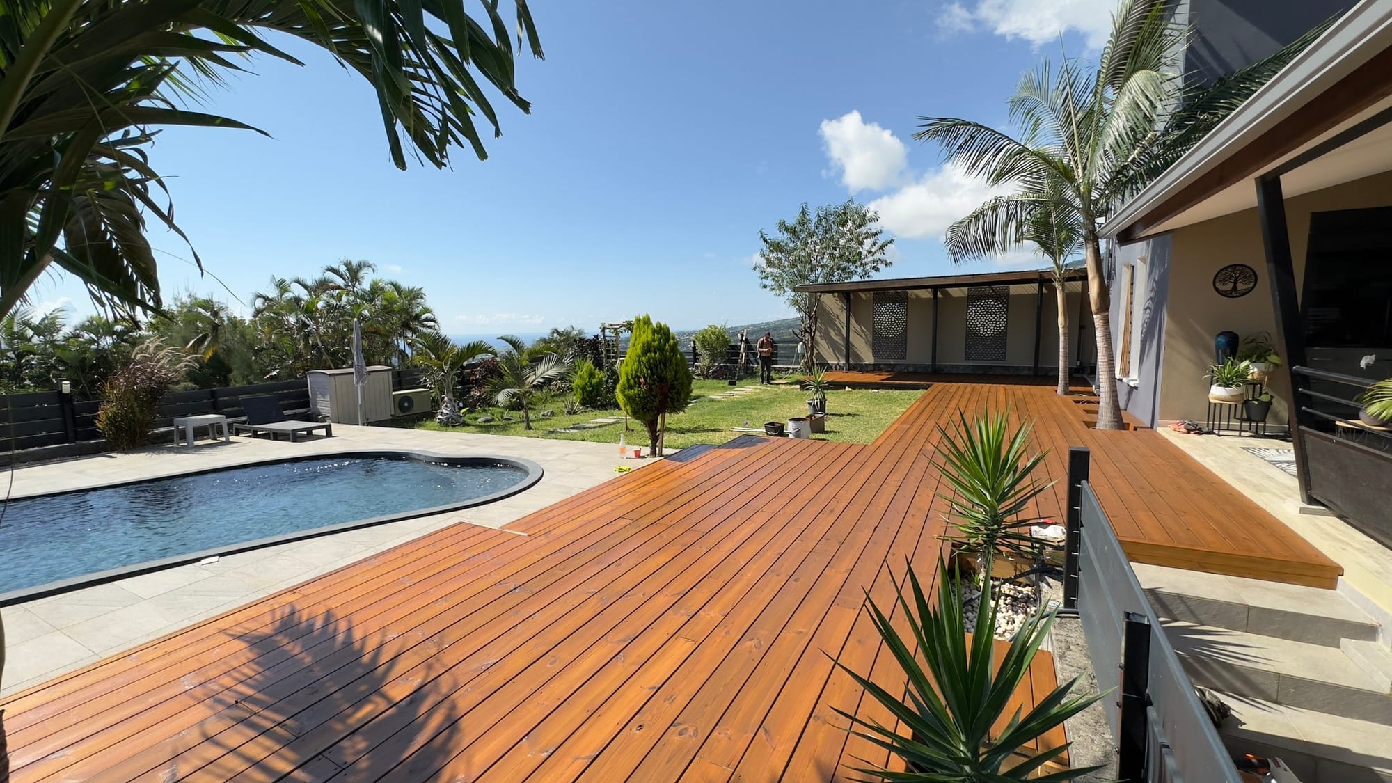 Chantier sur la ravine des citrons dans les hauts de l'entre-deux terrasse de 78 m2. 𝐏𝐡𝐨𝐭𝐨𝐬 𝟒𝐊 𝐀𝐯𝐚𝐧𝐭/𝐀𝐩𝐫𝐞̀𝐬. Application saturateur couleur teck